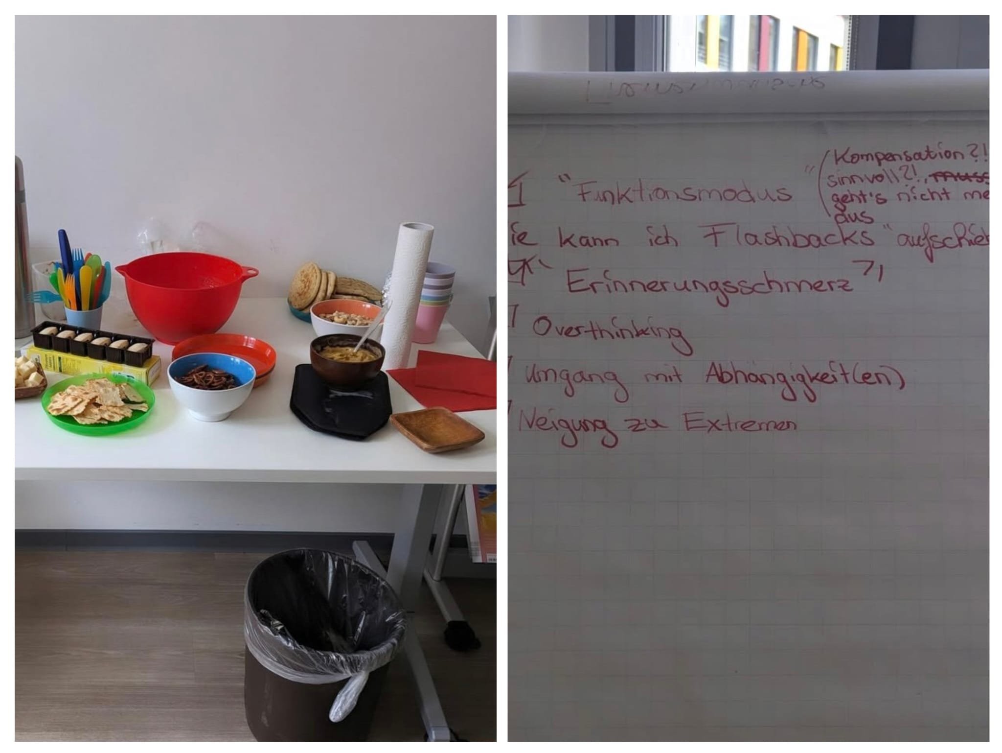 Durch das Bild könnt ihr einen kleinen Eindruck unserer regulären Gruppentreffen bekommen. Unsere aktuellen Themen und Anliegen sammeln wir meist am Flipchart. Während unserer Gruppentreffen gibt es immer ein kleines Buffet, für das jede:r der:die möchte eine Kleinigkeit mitbringen kann (Kuchen, Salat oder ähnliches). Das lockert die Atmosphäre ein wenig und ist natürlich lecker! :)